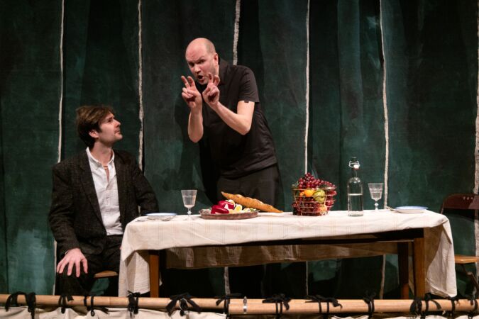 “Wat hebben wij hier te maken met zij daar, hier ver vandaan. Niet zó ver. Maar toch ver. 22 uur rijden. Het is nu 22.30 uur in Kyiv. Op 22 uur rijden liggen mensen met hun ogen open te hopen op stilte. Een stille nacht. Kinderen dromen geen kinderdromen. Op 22 uur rijden ligt een president met zijn ogen open naar het plafond te staren. Zijn zoon, op een onbekende plek, hoeveel uur rijden weten we dus niet, ligt ook naar het plafond te staren en prevelt zachtjes de namen van de wapens die te kort komen. Wat heeft dat met ons te maken? Wij die slapen zonder zorgen. Wij slapen in de aanloop naar deze voorstelling niet zorgeloos maar wel met andere zorgen dan 22 uur rijden hiervandaan. Laten we beginnen bij het begin.”
